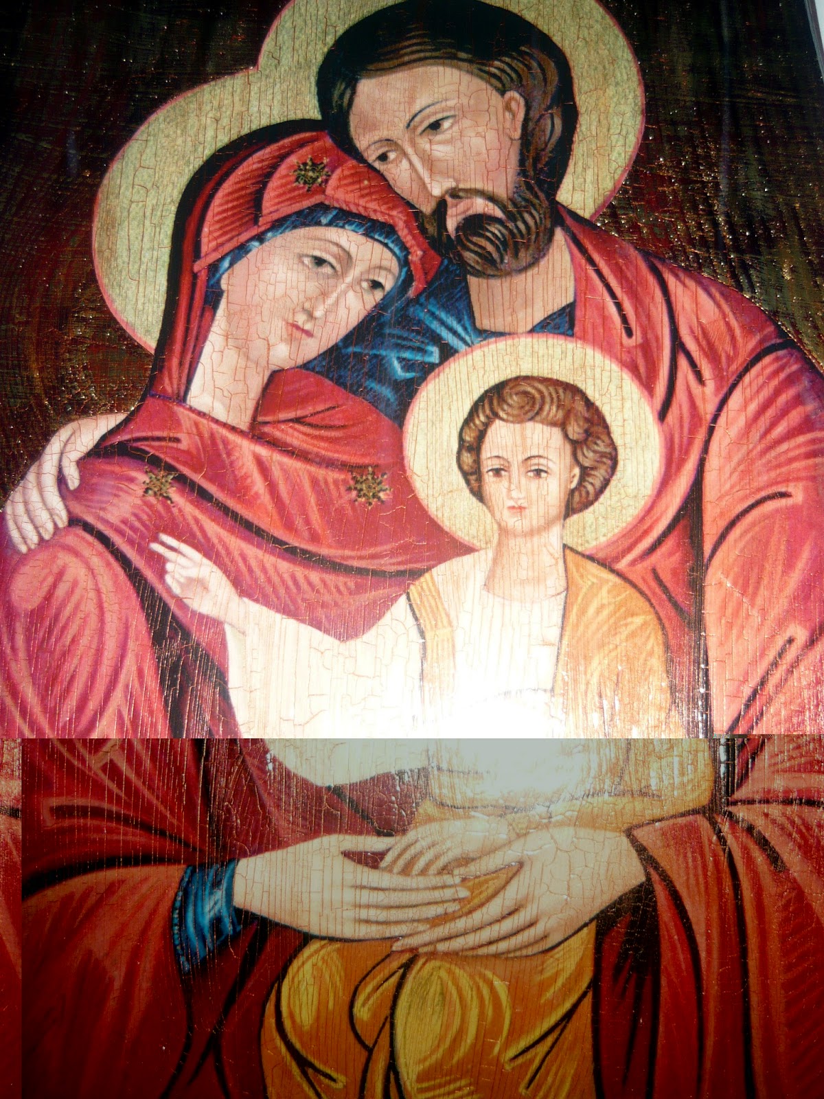 Jest to kopia fragmentu obrazu Świętej Rodziny z Mainz, który oryginalnie jest tryptykiem,wykonana na bejcowanej desce bukowej, ręcznie złocona, zdobiona w technice decoupage, postarzana różnymi technikami, wielokrotnie lakierowana.